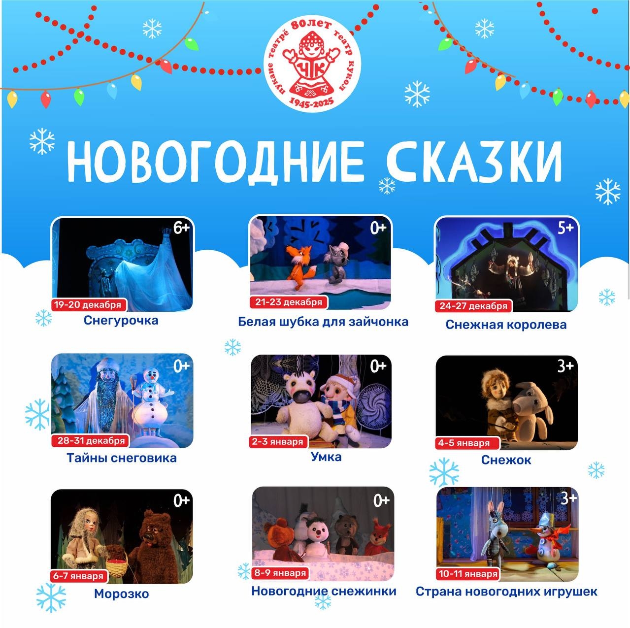 Новогодние представления в ТЕАТРАХ: Русский драмтеатр, Театр оперы и балета, Филармония, Театр Марионеток, Театр кукол, Театр юного зрителя, Чебоксарский камерный театр, Чувашский драматический театр, Экспериментальный театр драмы.