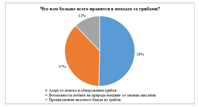 Зачем идти по грибы. На вопрос о мотивации для похода за грибами каждый второй (50%) ответил, что ценит его как возможность побыть наедине с природой и своими мыслями. Чуть более трети (37%) привлекают азарт поиска и обнаружения «добычи». Лишь 12% указали как основной мотиватор предвкушение вкусного блюда.