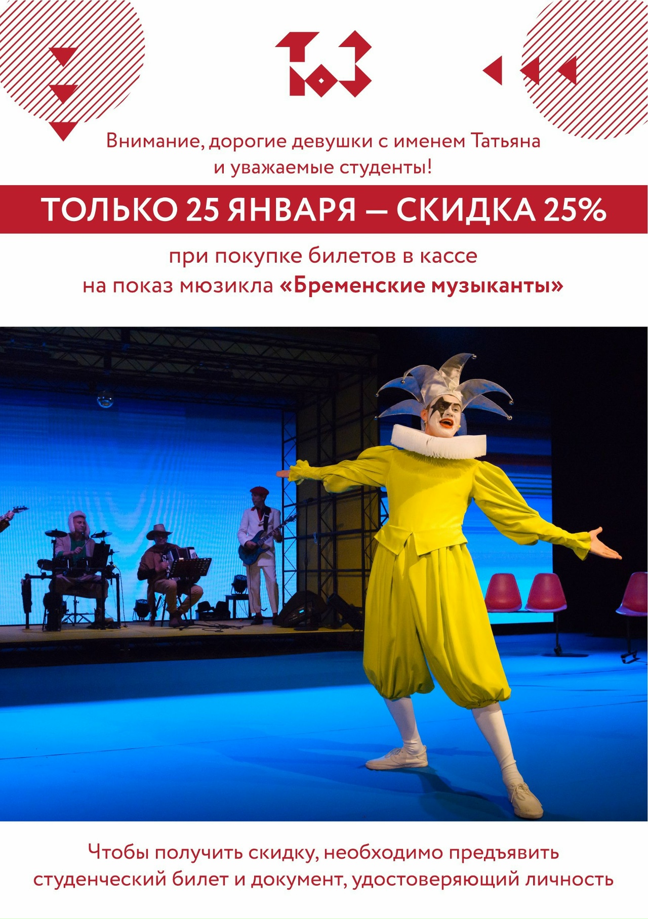 Всем Татьянам и студентам скидка 25% на билеты в кассе театра на мюзикл «Бременские музыканты». Подробности...