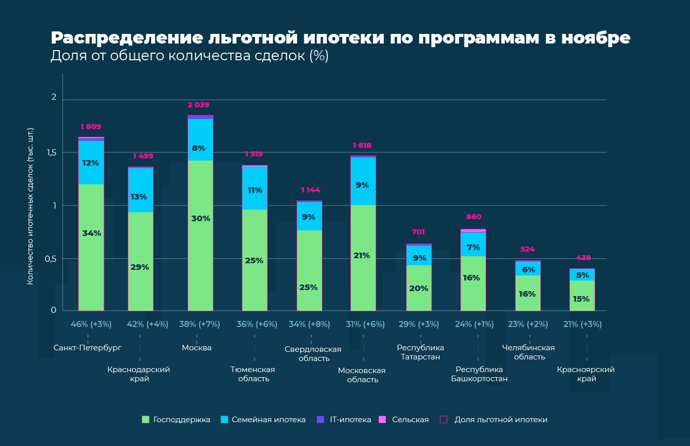 Значительно меньшим спросом пользуются программы «Дальневосточная ипотека», «IT-ипотека», «Сельская ипотека». По итогам ноября, несмотря на повышенное внимание покупателей к программе господдержки и семейной ипотеки, доли сделок по этим программам по стране остаются невысокими — 1,9%, 0,3% и 0,5% соответственно.