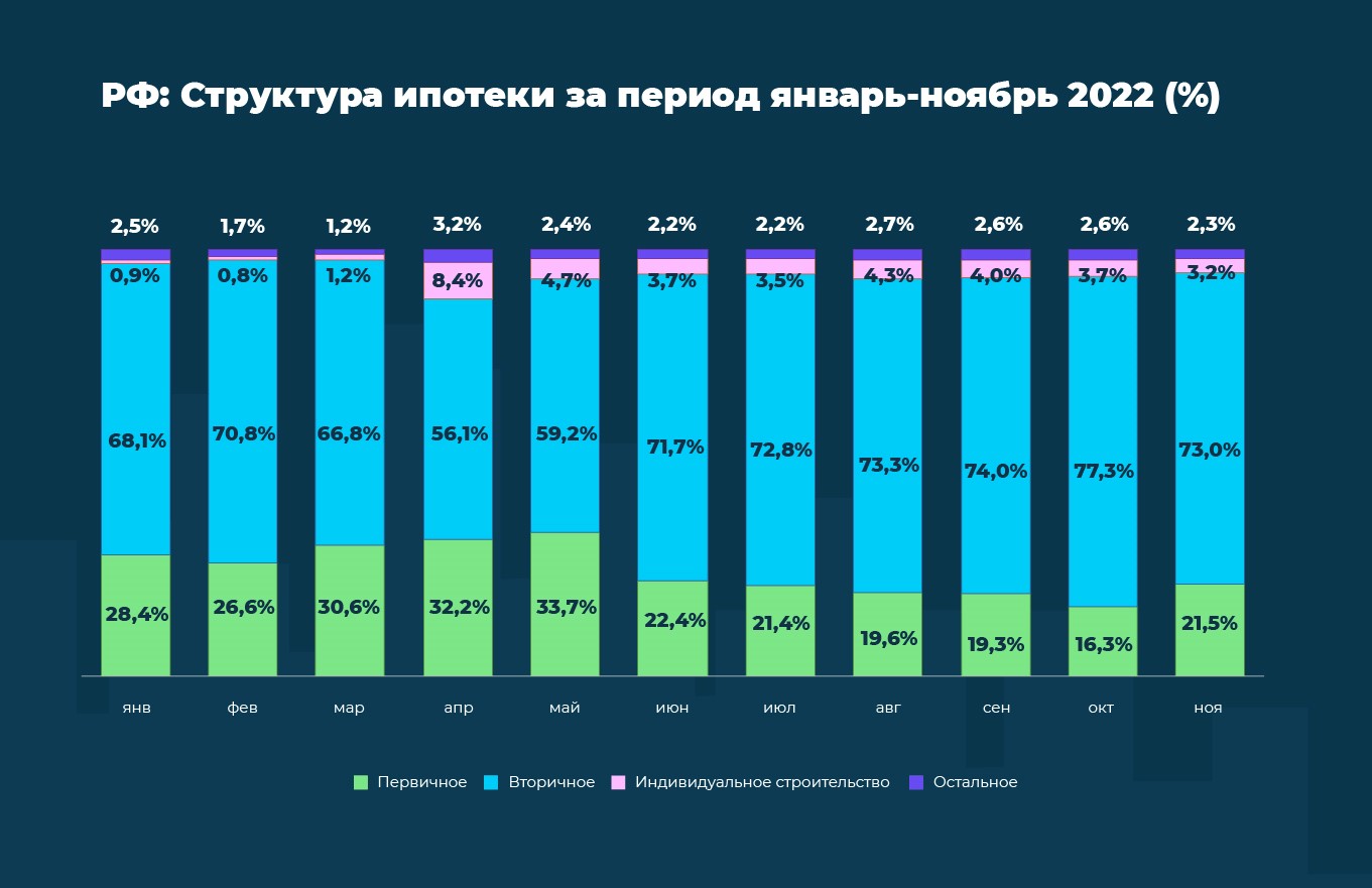 Динамика распределения ипотеки по типам кредитов (приобретение первичного и вторичного жилья, индивидуальное строительство, остальное: нецелевой кредит под залог недвижимости, рефинансирование, военная ипотека) для всей России за период январь–ноябрь 2022.