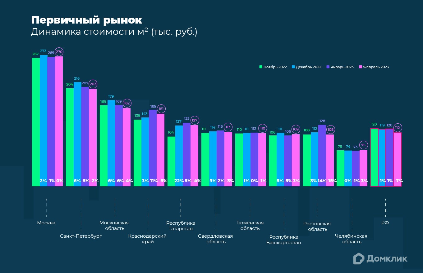 В Москве, Санкт-Петербурге и Московской области квартиры подорожали ненадолго и уже в феврале вернулись к значениям ноября или ниже. Однако в ряде регионов высокий спрос на первичное жильё сохранялся и в январе, поэтому цены продолжили расти. Спад уровня цен фиксируется только в феврале. Такая ситуация отмечена в Краснодарском крае, Республике Татарстан, Свердловской, Тюменской и Ростовской областях.