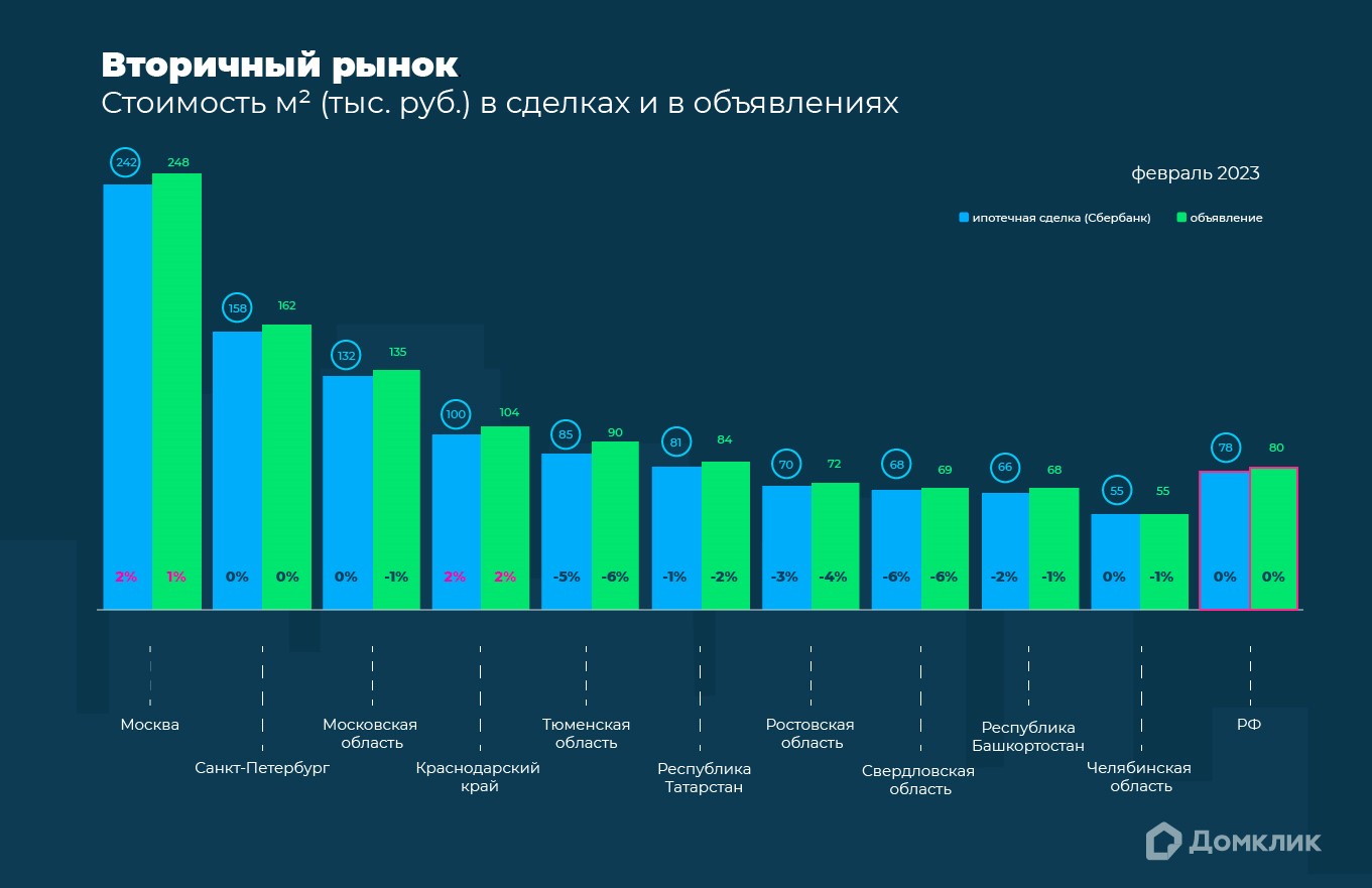 В целом по России цены на вторичную недвижимость в феврале практически не изменились — в среднем это 78 тыс. рублей за квадратный метр. По данным реализованных объявлений на Домклик, средняя цена предложения также сохранилась на уровне 80 тыс. рублей за м2.
