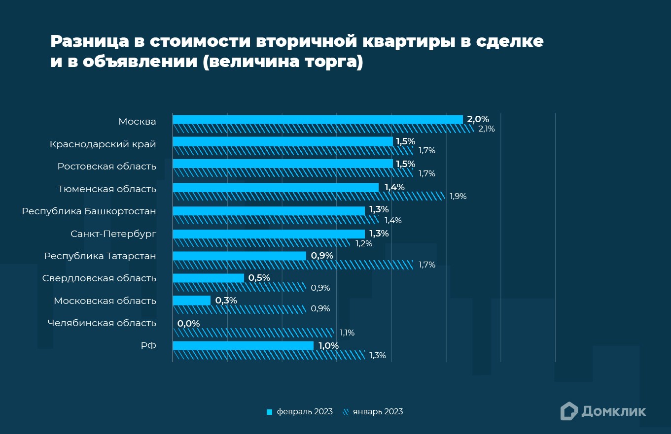 Разница в стоимости вторичной квартиры по сделкам и по соответствующему объявлению (величина торга) для топ-10 регионов по количеству ипотечных сделок. Приведены актуальные данные за февраль 2023 года (обозначены синим). Для сравнения приводятся данные за январь 2023 года (обозначены штриховкой). Данные отсортированы по величине торга в феврале 2023 года.