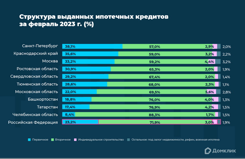 Распределение ипотеки по типам кредитов в марте 2023 года (топ-10 регионов по количеству выдач). Приобретение первичного и вторичного жилья обозначены как «Первичное» и «Вторичное» соответственно. Приведены данные по индивидуальному строительству. «Остальное» включает в себя нецелевые кредиты под залог недвижимости, рефинансирование, военную ипотеку. Данные сортированы по доле сделок по покупке первичной недвижимости в общем объёме выдач.
