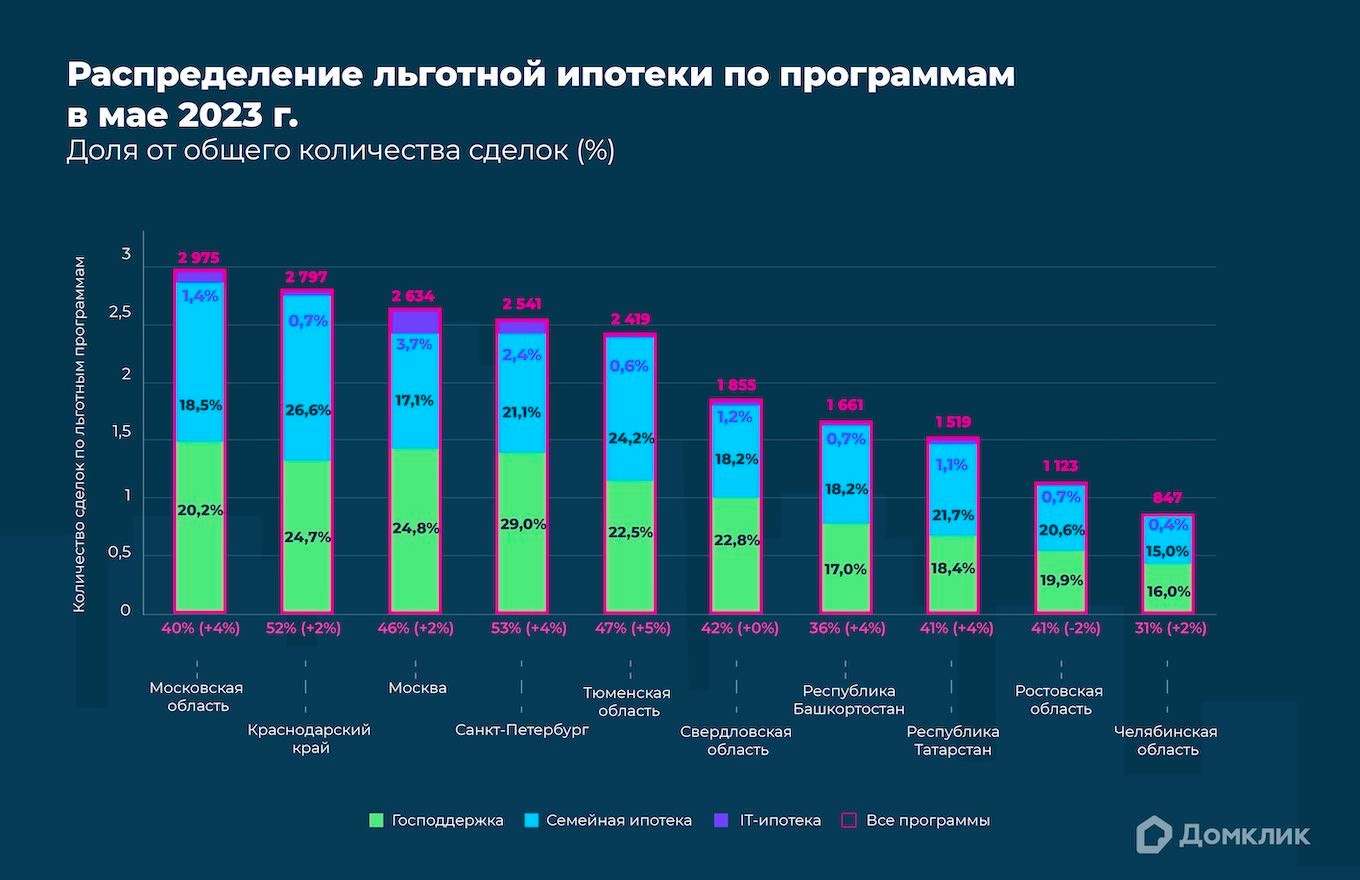 Количество выданных кредитов по льготным программам в мае 2023 года (топ-10 регионов по количеству выдач). Количество сделок по программе «Господдержка» и доля выдач относительно общего количества ипотек за месяц показаны зелёным, количество сделок и доля выдач по «Семейной ипотеке» — синим, по «Ипотеке для IT» — фиолетовым. Сделки по «Сельской ипотеке» и «Дальневосточной ипотеке» в данных регионах отсутствуют. Данные отсортированы по суммарному количеству сделок по всем льготным программам.
