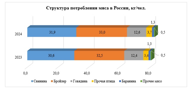 Тем не менее, дальнейший прирост до прогнозируемых 83 кг по итогам 2024 года обеспечат традиционные лидеры: свинина и бройлер, считает Андрей Дальнов.