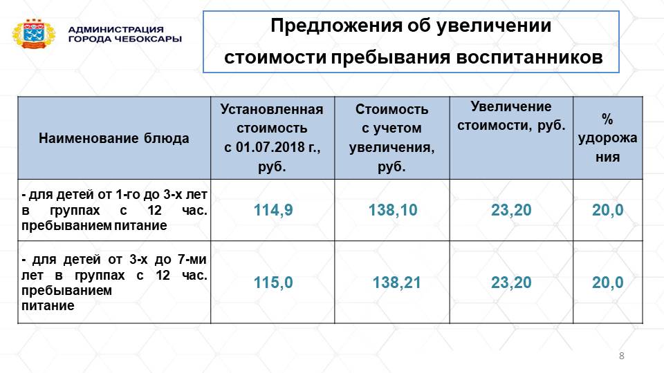 Так, стоимость питания в детских садах вырастет на 23 рубля. За пребывание в детском саду ребенка в возрасте от 1-го до 3-х лет стоимость родительской платы увеличится с 114,9 до 138,1 рублей, а для ребенка от 3-х до 7-ми лет – с 115 до 138,2 рублей.