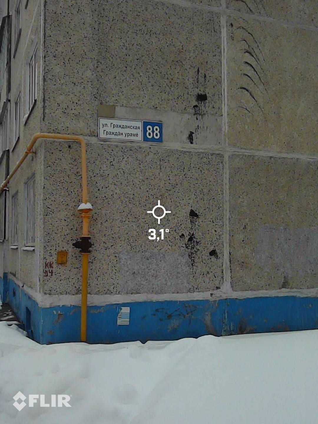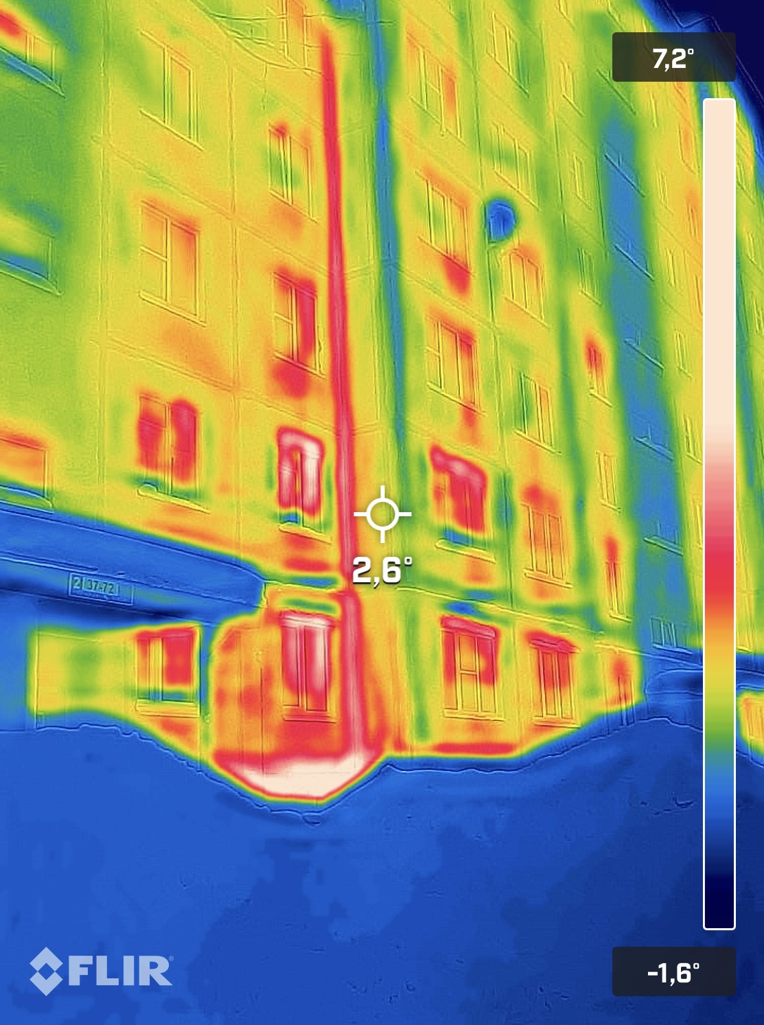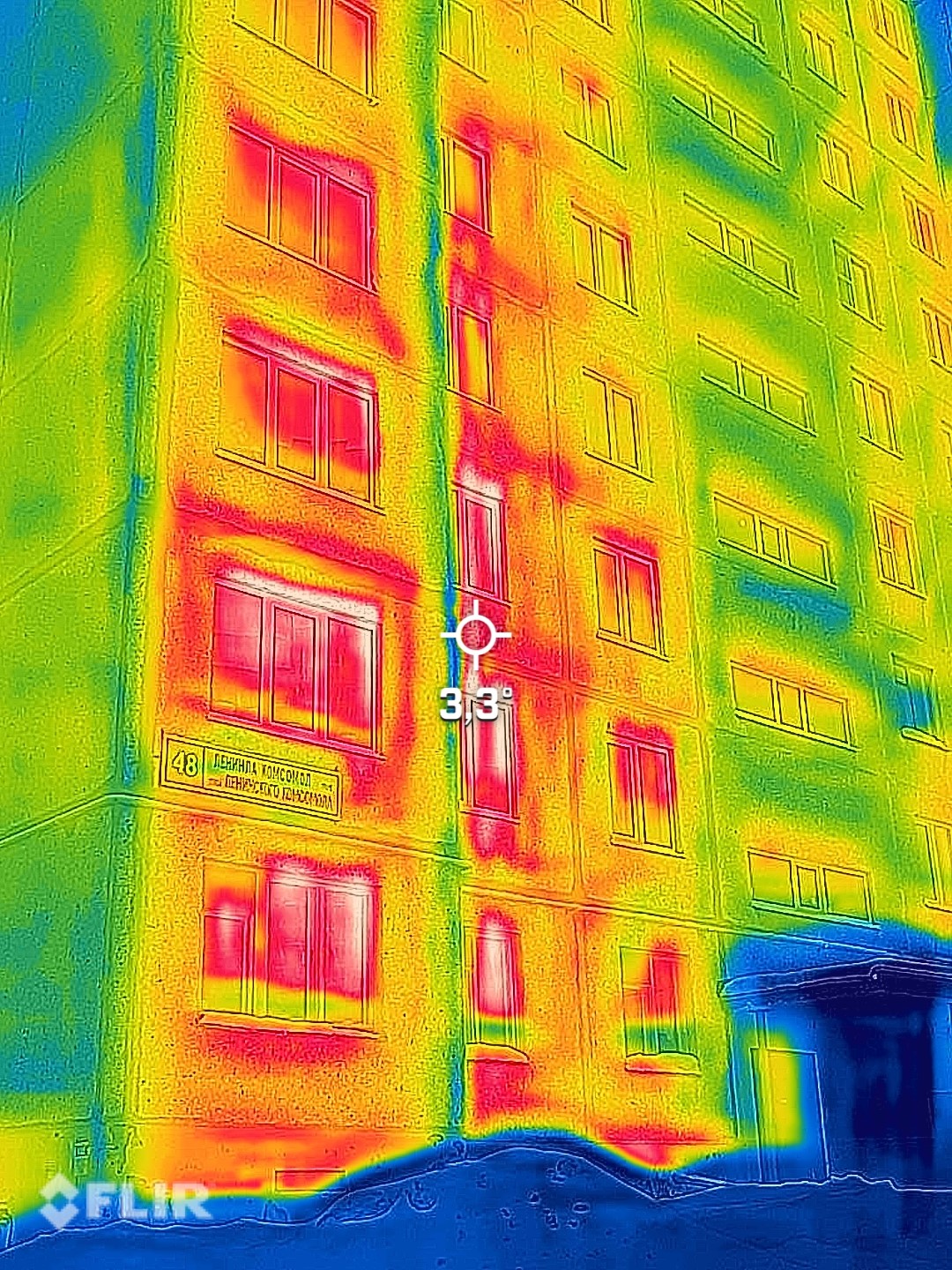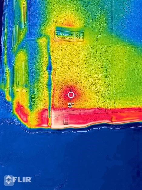 В архивах не сохранилась серия дома, но исследование показало, что это один из самых холодных домов в городе. Он теряет до 62% тепла. Значительное количество тепла уходит на стыке двух стен – на снимке это видно по вертикальной красной линии во всю высоту, а также мостиках холода.