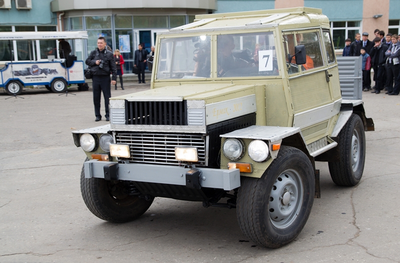 Настало время «покрасоваться» для следующего участника. Вначале из ряда стоящих тракторов выглянуло что-то похожее на уменьшенный «Хаммер». Но затем «малыш» песочного цвета потянул за собой длинную тележку. Полноценная машина, которую сложно назвать трактором, сделала пару кругов, демонстрируя всем свое имя «Ермак - 2012», высеченное на капоте. Не трудно догадаться, что изобретение носит фамилию своего автора. Николай Ермаков рассказал, что его «Хаммер» может ускориться до 40 км/ч. «Но это все-таки не Хаммер, а Ермак, — заявил инженер, когда ведущий назвал его изобретение именем американского вездехода. — Когда люди на дороге видят его, в основном они показывают так», — тут он поднял большой палец верх. Николай Ермаков получил денежную премию в размере 3 тыс. рублей за победу в номинации «Оригинальное техрешение».