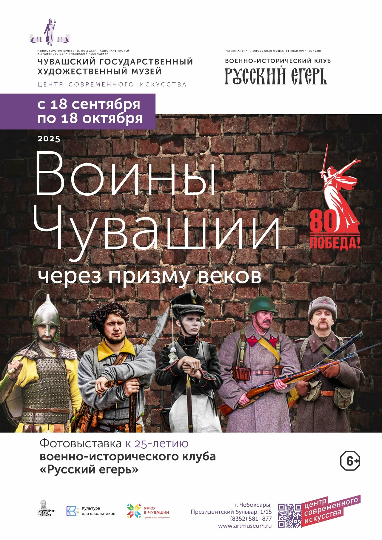 8 сентября 2000 г. на базе МБОУ СОШ № 62 был создан кружок по изучению военной истории с применением методов исторической реконструкции. Прошло 25 лет, и уже Региональная Молодежная Общественная Организация Военно-Исторический Клуб «Русский егерь», представляет вашему вниманию, результат своей 25-летней деятельности в фотовыставочном проекте "Воины Чувашии, через призму веков", где отражены образы воинов Чувашии от Раннего средневековья, до Великой Отечественной войны.