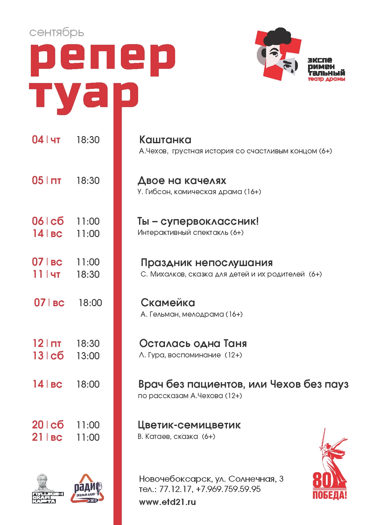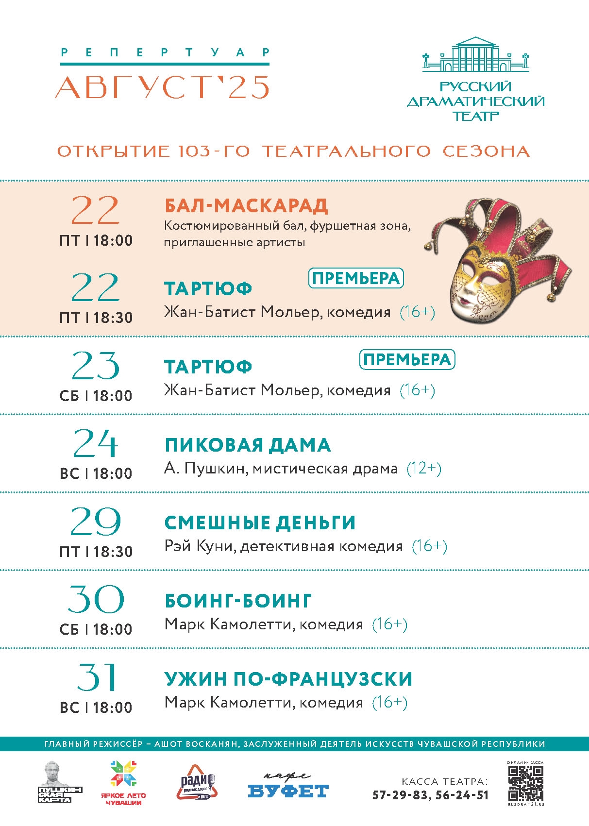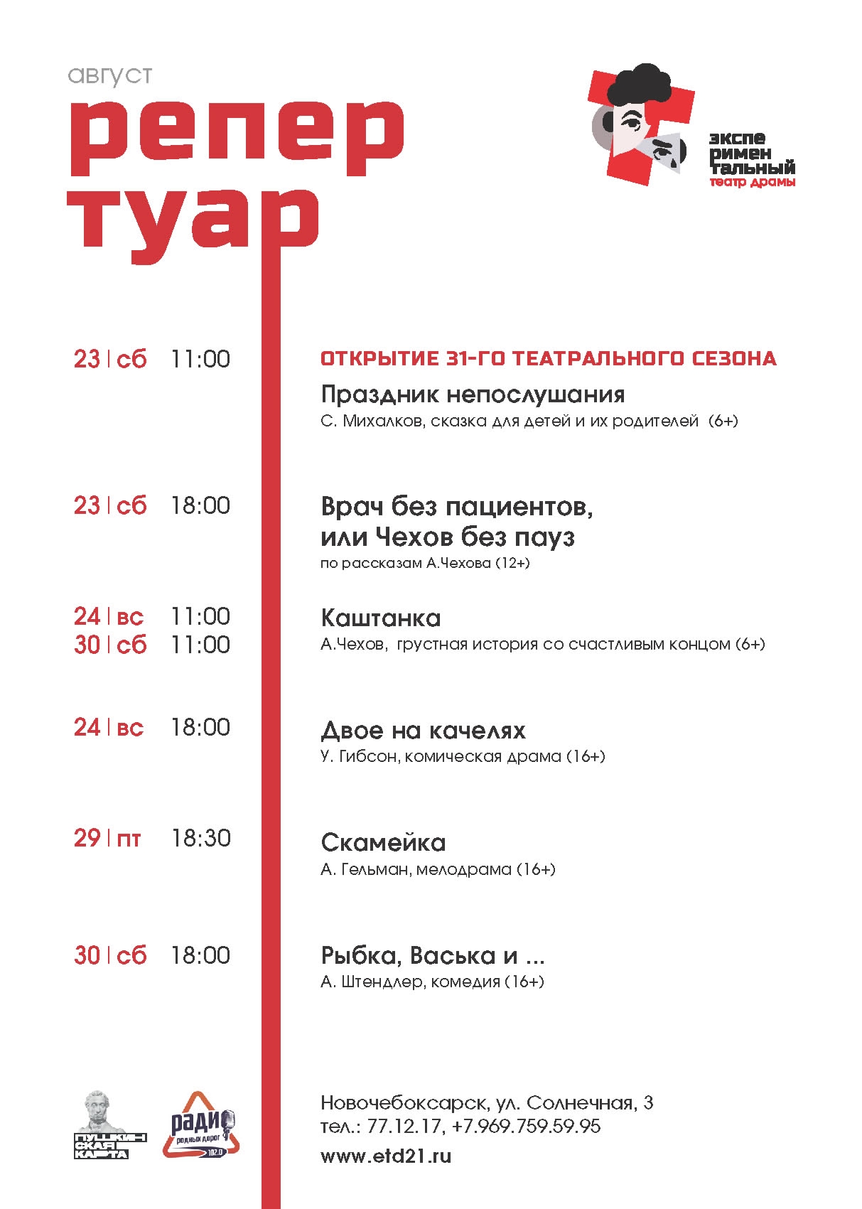Репертуар чебоксарских театров включает более сотни различных спектаклей. Чтобы вам было легче ориентироваться в таком разнообразии постановок, мы собрали в одном месте афиши всех театров Чебоксар. Напомним, что в нашем городе их девять. Это Русский драмтеатр, Театр оперы и балета, ТЮЗ, Театр кукол, Камерный театр, театр Станиславский.com, МАЙленький театр, Филармония, Чувашский драмтеатр и Экспериментальный театр.
