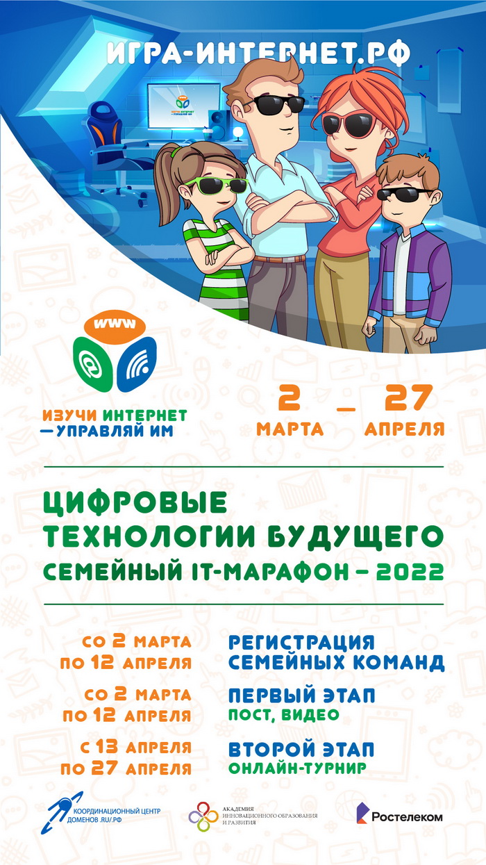 «Ростелеком», Академия инновационного образования и развития и Координационный центр доменов .RU/.РФ сообщают об открытии регистрации на VI Всероссийский семейный ИТ-марафон. К участию приглашаются семейные команды, состоящие из школьников 5–11 классов, их родителей, родственников или близких друзей, а также членов управляющих советов образовательных организаций. ИТ-марафон пройдет со 2 марта по 27 апреля 2022 года на официальном сайте проекта «Изучи интернет — управляй им!». Регистрация участников продлится до 12 апреля включительно. Результаты будут объявлены в рамках Всероссийского родительского форума, который пройдет в преддверии Международного дня семьи 13 мая.