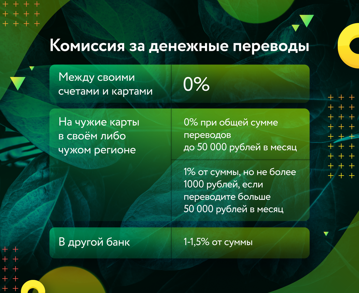 Если по вашим переводам за месяц набирается свыше 50 000 рублей, то все переводы сверх этой суммы будут идти с комиссией в 1%, но не более 1000 рублей. Например, вы сделали три перевода по 25 000 рублей: первые два пройдут с нулевой комиссией, а за третий банк возьмёт 250 рублей.