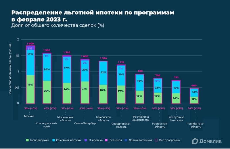 Количество выданных кредитов по льготным программам в феврале 2023 года (топ-10 регионов по количеству выдач). Количество сделок по программе господдержки и доля выдач относительно общего количества выдач за месяц показана зелёным, количество сделок и доля выдач по «Семейной ипотеке» — синим, по «Ипотеке для IT» — фиолетовым, по «Сельской ипотеке» — розовым. Данные отсортированы по суммарному количеству сделок по всем льготным программам.