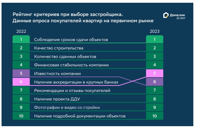 Наличие аккредитации в крупных банках заняло пятое место в рейтинге, а известность компании — шестое. Годом ранее эти критерии располагались в обратном порядке. По-прежнему меньше всего покупателей волнуют наличие проекта договора долевого участия (ДДУ), фото и видео со стройки, а также подробной документации.