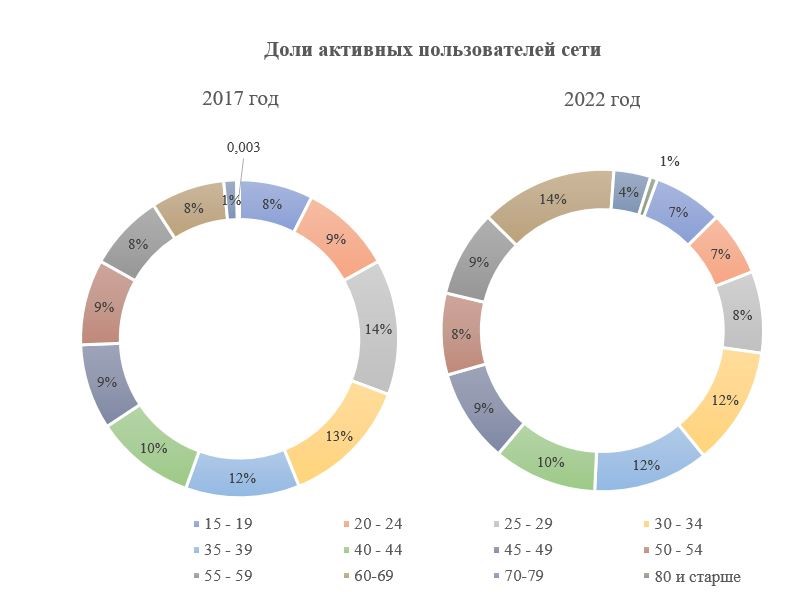 ри этом за последние пять лет на селе самой динамичной возрастной категорией стало поколение бэби-бумеров: наибольший прирост доли активных пользователей сети на сельской местности наблюдается в возрастных группах от 55 до 59 лет (прирост 2022 к 2017 составил 32%), от 60 до 69 лет (прирост 2022 к 2017 в 2,3 раза), 70-79 лет – (прирост 2022 к 2017 в 2,8 раза) и старше 80 лет (прирост 2022 к 2017 в 2 раза).