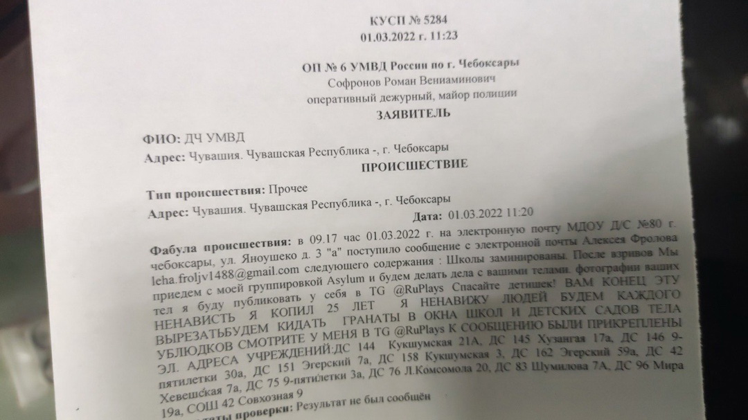 Напомним, на протяжении трех дней на электронные адреса садиков и школ в Чебоксарах, а также Чебоксарском районе поступали сообщения о возможном теракте. «Школы заминированы….Эту ненависть я копил 25 лет…. Будем кидать гранаты в окна школ и детских садов», – говорилось в одном из таких сообщений.