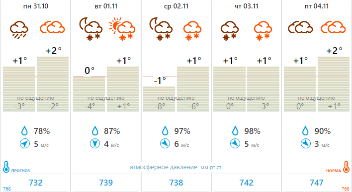 Сегодня днем ожидается переменная облачность, +1...+3°, ветер западный, умеренный. Давление немного ниже нормы. Вечером – небольшой снег. Ближайшей ночью переменная облачность, сильный снег, температура -1...+1°. Давление немного ниже нормы.