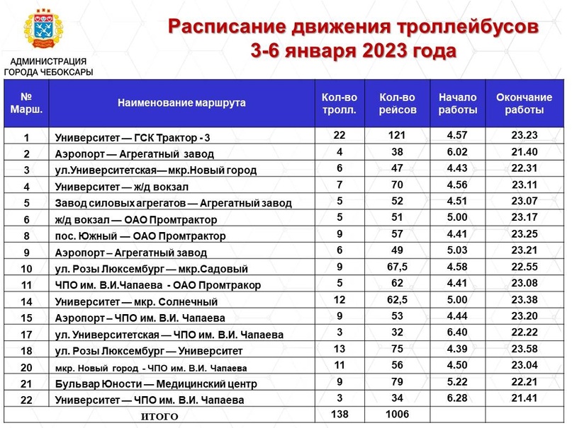 В новогодние праздники графики работы общественного транспорта в Чебоксарах будут скорректированы. Так в новогоднюю ночь автобусы и троллейбусы на основных магистральных маршрутах будут работать до часа ночи 1 января 2023 года.