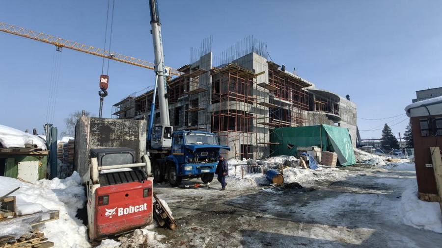 На строительной площадке одновременно ведутся несколько видов работ. Строители выполняют устройство каркаса здания, продолжают кирпичную кладку, в подвальном помещении проводятся сантехнические работы. Уже заказана насосная станция, смонтированы две пожарные ёмкости объёмом по 200 кубометров каждая, выполняются работы по врезке в систему водоснабжения.