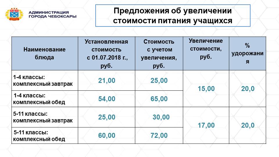 Завтраки в начальных классах будут стоить 25 рублей (+4 рубля), обеды – 65 рублей (+11 рублей). Ученики 5-11 классов будут платить за завтраки 30 рублей (+5 рублей), за обеды – 72 рубля (+12 рублей). В итоге в начальных классах питание в целом подорожает на 15 рублей, а для средних и старших классов – на 17 рублей.