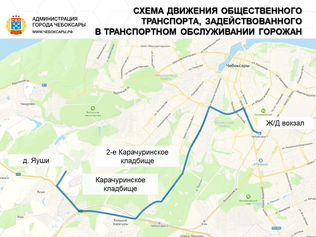 До кладбища, расположенного по Вурнарскому шоссе, можно добраться на автобусе №46. До кладбища по улице Заовражная ездит автобус №52. Стоимость проезда, как и на городских маршрутах, составит 26 рублей по карте и 29 рублей наличными.