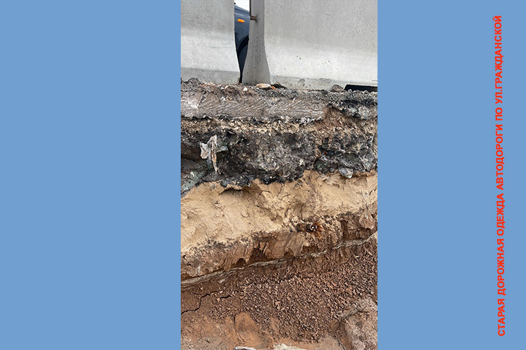 Интерес для строителей представляет и старая дорожная одежда в разрезе. В основании полотна, например, есть шлак с агрегатного завода и камень песчаник.
