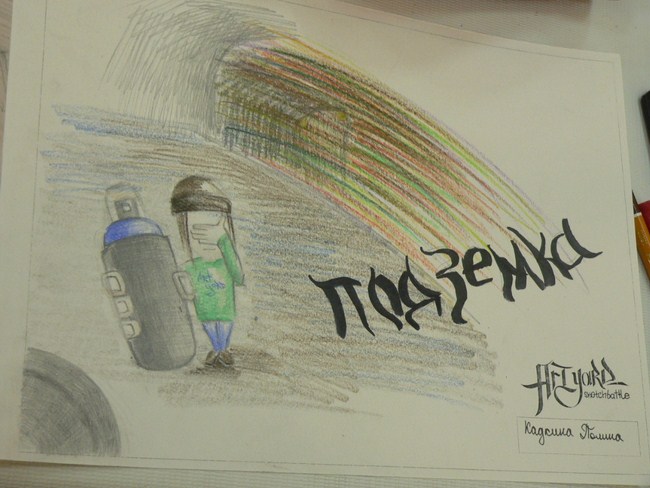 Вместо баллонов с красками — карандаши и маркеры. А вместо серых стен — чистые листы бумаги. Поэтому правильнее назвать мероприятие конкурсом эскизов граффитчиков, что, кстати говоря, не помешало участником продемонстрировать свой талант и владение мастерством рисования на стенах