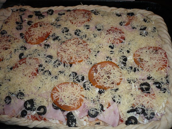 - Тесто смазать кетчупом, уложить слоями подготовленную начинку: лук, яйца, ветчину, маслины, помидоры. Сверху присыпать тёртым сыром.