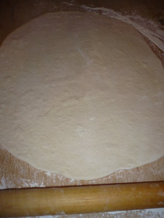- Раскатать тонко тесто в форме круга или же по форме противня. Переложить на противень, смазанный маслом.