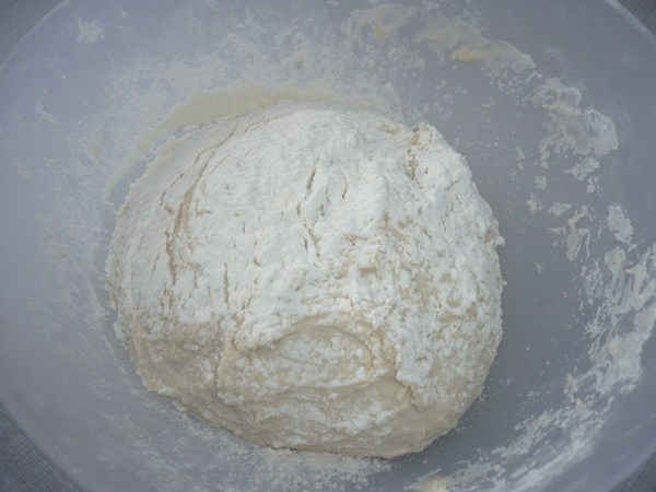 - В миску просеять муку вместе с солью. Всыпать сахар и дрожжи. Перемешать, влить тёплую воду. Замесить тесто. Вымешивать тесто не менее 10-15 минут. Скатать в шар, сбрызнуть оливковым маслом. Накрыть плёнкой и поставить в тёплое место на 1 час.