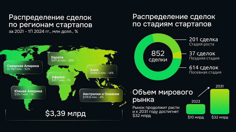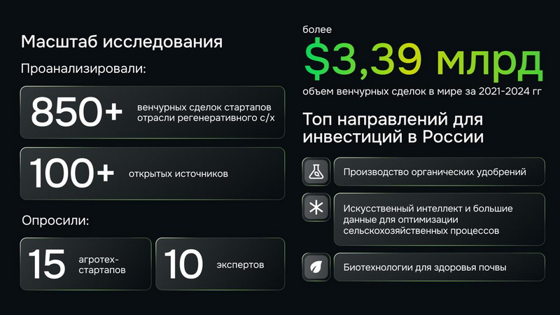 В рамках своего исследования было проанализировано более 4-х тысяч сделок в сельском хозяйстве за период с начала 2021 года по конец первого полугодия 2024 года. В финальную выборку попало 852 венчурные сделки, которые наиболее четко отражали внедрение «устойчивых» практик в аграрной сфере и бережного отношения к природным ресурсам. Общий объем инвестиций в регенеративное сельское хозяйство за анализируемый период на мировом рынке составил более 3,39 млрд долларов.