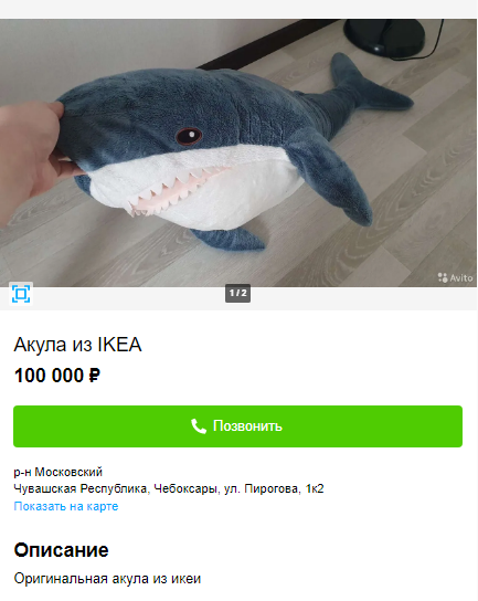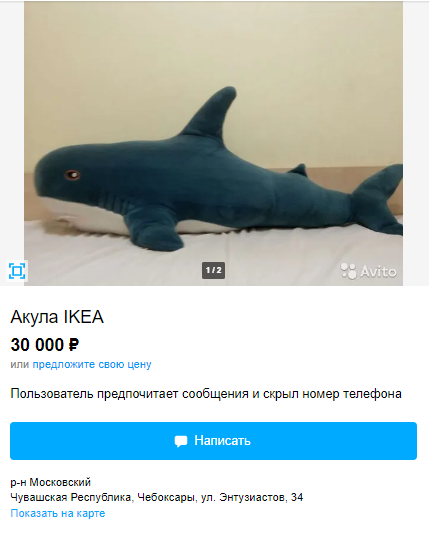 После закрытия шведской компании ИКЕА в России на интернет-сервисах по размещению объявлений стали массово появляться предложения о продаже товаров из легендарного магазина. Самой популярной стала 100-сантиметровая плюшевая игрушка акула Блохэй. Товар пользовался огромным спросом еще во времена, когда продавался в ИКЕА, а теперь его продают как память об ушедшей из страны компании.