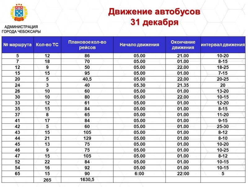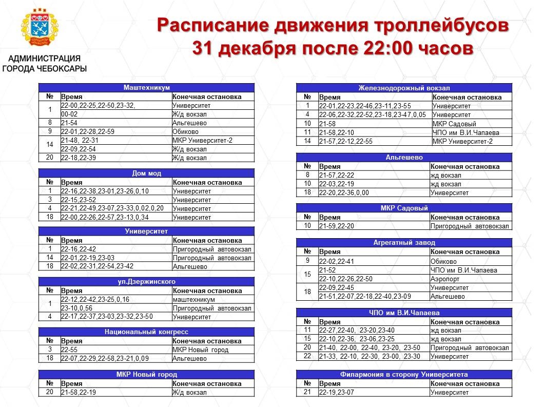 В новогодние праздники графики работы общественного транспорта в Чебоксарах будут скорректированы. Так в новогоднюю ночь автобусы и троллейбусы на основных магистральных маршрутах будут работать до часа ночи 1 января 2023 года.