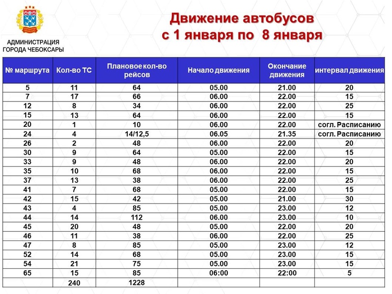 С 1 по 8 января автобусы будут работать по графикам выходного дня. На маршрутах задействуют 240 автобусов среднего, большого и малого класса. Планируется, что в праздничные дни автобусы будут совершать по 1228 рейсов ежедневно.