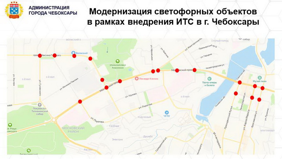 Автоматизированное управление городскими дорогами действует в Чебоксарах с 2015 года. Всего в городе установлен 151 светофор, 72 из них подключены к «зеленой волне». В мэрии отмечают, что это позволило координировать движение транспорта на особо загруженных участках – проспектах М. Горького, Тракторостроителей, Ивана Яковлева, Московском проспекте, улицах Композиторов Воробьевых, Калинина, Гагарина.