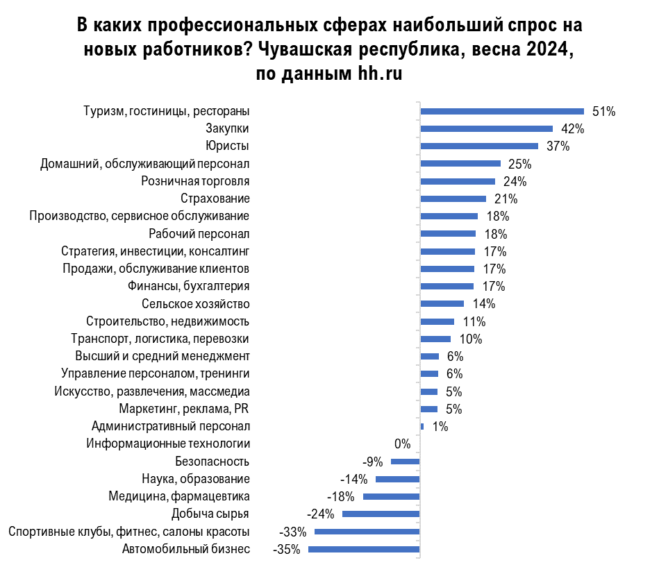 Компании стали активнее, чем в прошлом году искать рабочий персонал (+18% новых рабочих мест), сотрудников в сфере продаж, финансистов и инвесторов (+17%), работников в сферу сельского хозяйства (+14%). При этом в Чувашии есть несколько профессиональных сфер, где напротив произошло снижение спроса на сотрудников. Это безопасность, наука и образование, медицина, добыча сырья, фитнес, автомобильный бизнес.