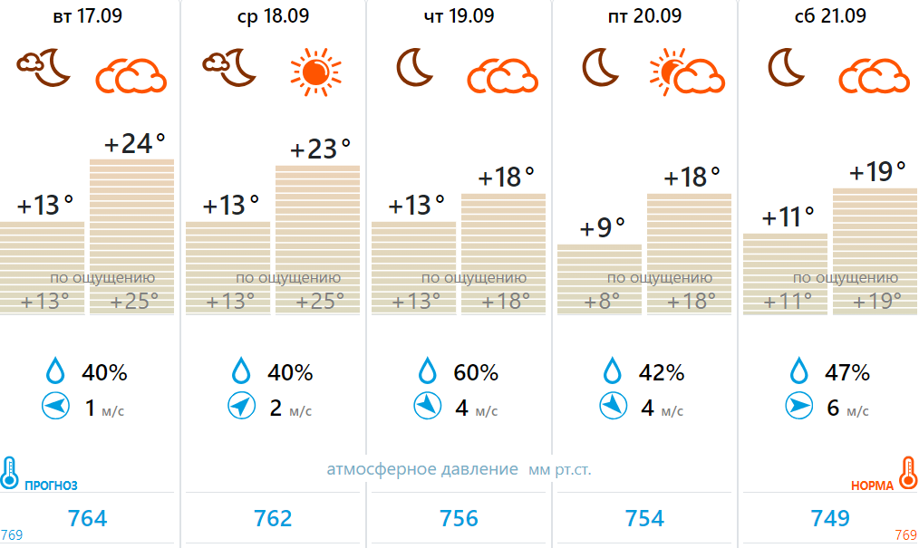 Пока антициклон удерживает тёплую и солнечную погоду, до среды дневные температуры будут держаться на уровне 22-24 градусов, а ночные – около 10-12 градусов. Однако уже в четверг с приближением холодного фронта ожидаются кратковременные дожди, а в пятницу подует холодный северо-западный ветер, который снизит дневные температуры ниже 20 градусов. В начале следующей недели возможны первые заморозки.