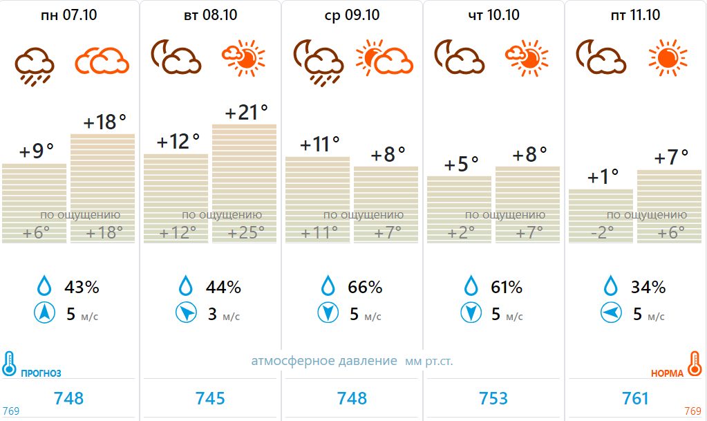 С середины недели температура резко понизится: в среду термометры покажут +5°C днем, а ощущаемая температура из-за северного ветра будет около нуля. Затем арктический воздух продолжит снижать температуру. К выходным ожидается установление антициклона с сухой погодой и слабым ветром. В дневные часы температура будет держаться около 5-10°C, а по ночам возможны заморозки до -4°C.