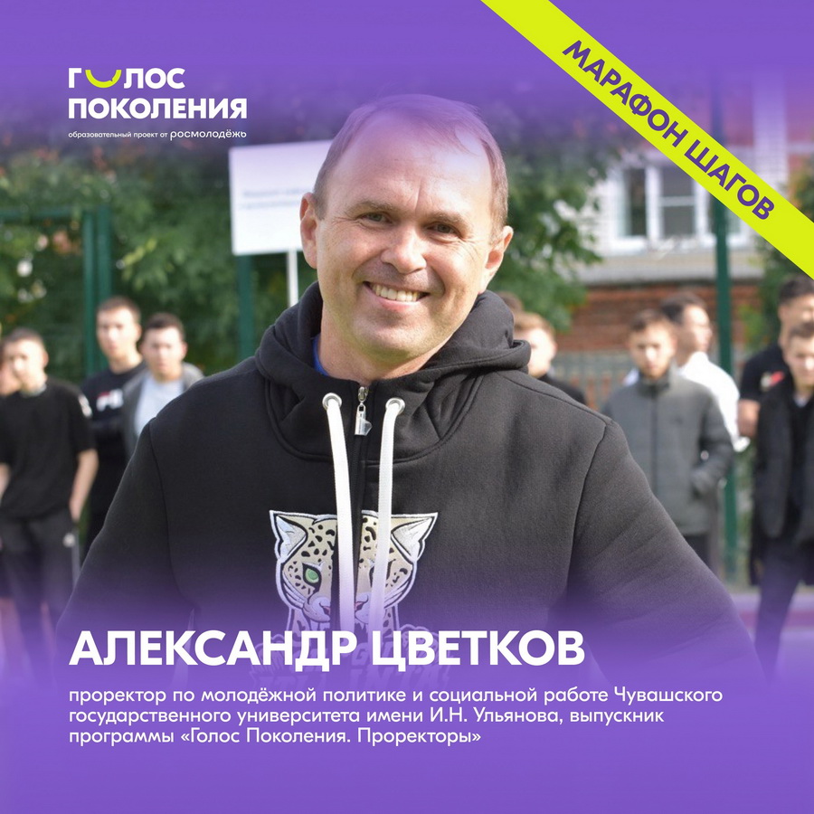 Проректор по молодежной политике и социальной работе ЧГУ им. Ульянова Александр Цветков победил в конкурсе среди выпускников проекта «Голос Поколения» от Роскоммолодежи, пройдя 990 тысяч шагов с 21 августа по 22 сентября. Цветков отметил, что ходьба – его давнее увлечение, и проходить до 30 тысяч шагов в день ему было несложно, просто пришлось увеличить привычную дневную норму.