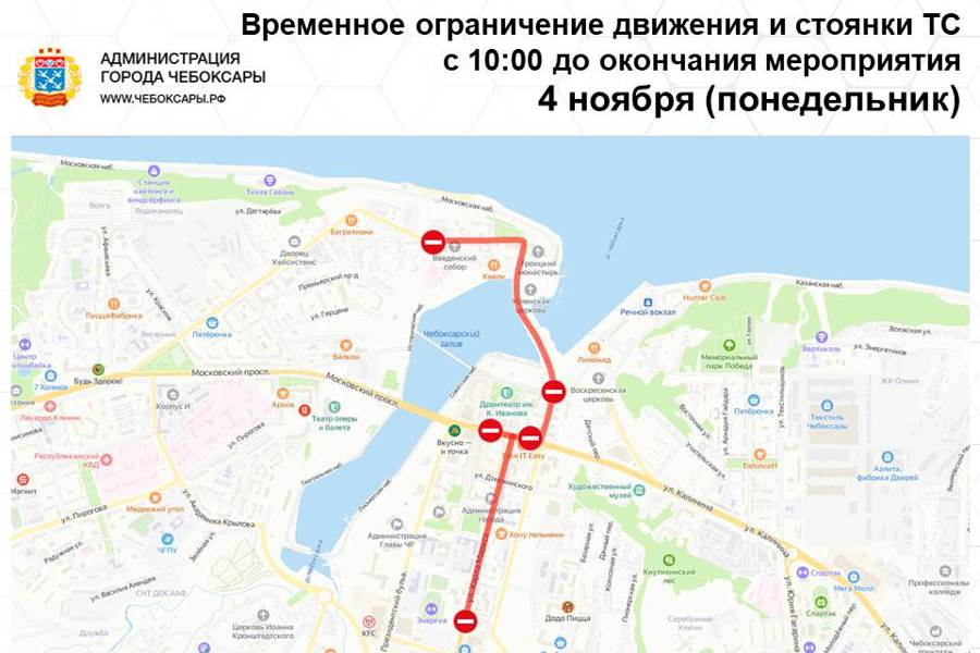 4 ноября, в день празднования Казанской иконы Божией Матери, центр Чебоксар будет закрыт для движения всех видов транспорта с 10:00 и до окончания мероприятий. Ограничения затронут участок от Введенского кафедрального собора на улице Константина Иванова, через дамбу «Дорога к Храму», до площади Республики. Соответствующее постановление подписал глава города Владимир Доброхотов.