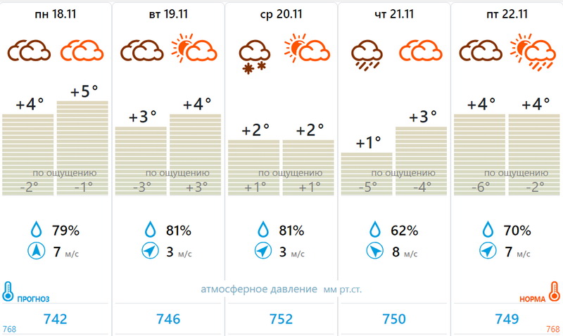 С понедельника по среду под влиянием холодного фронта атлантического циклона в республике пройдут осадки. В понедельник и вторник они будут в виде дождя, но уже с вечера вторника начнётся мокрый снег, местами возможен временный снежный покров. 20 ноября в Чебоксарах вероятны прояснения, ветер ослабнет, создавая временную передышку от ненастья.