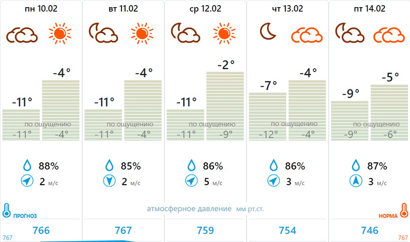 Холодный период, по предварительным прогнозам, затянется как минимум на неделю. Несмотря на морозные ночи, в целом вторая декада февраля ожидается примерно на 1–2 градуса теплее многолетних средних значений.