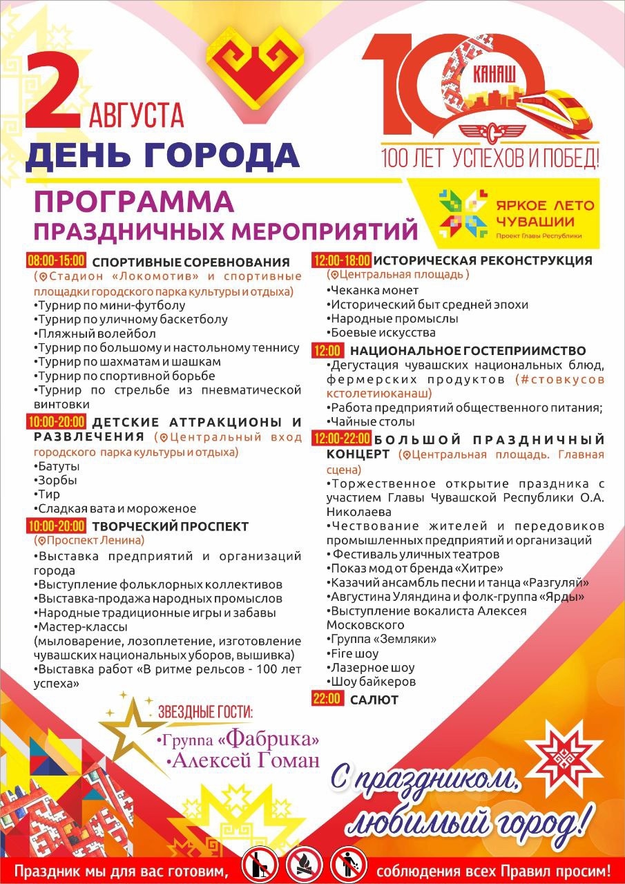 2 августа Канаш отпразднует своё 100-летие. В юбилейный день жителей и гостей города ждёт масштабная программа с праздничными открытиями, концертами, театрализованными шествиями, спортивными соревнованиями и вечерним лазерным шоу.